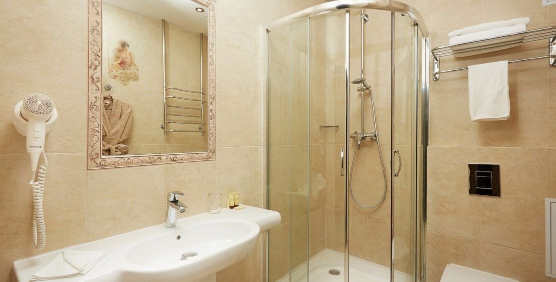 Санузел: душевая кабина или ванна, раковина, унитаз, фен, тапочки, туалетные принадлежности