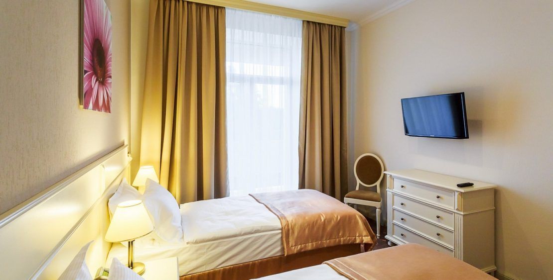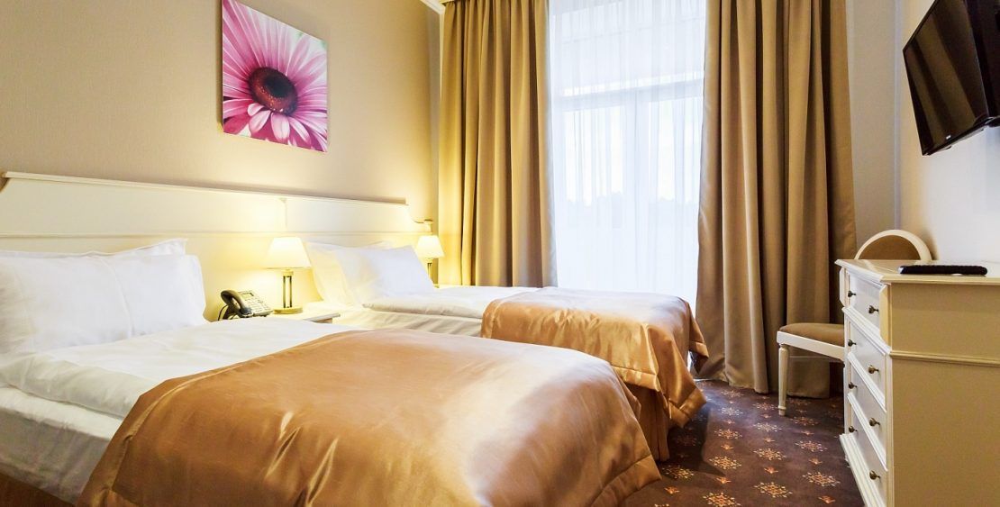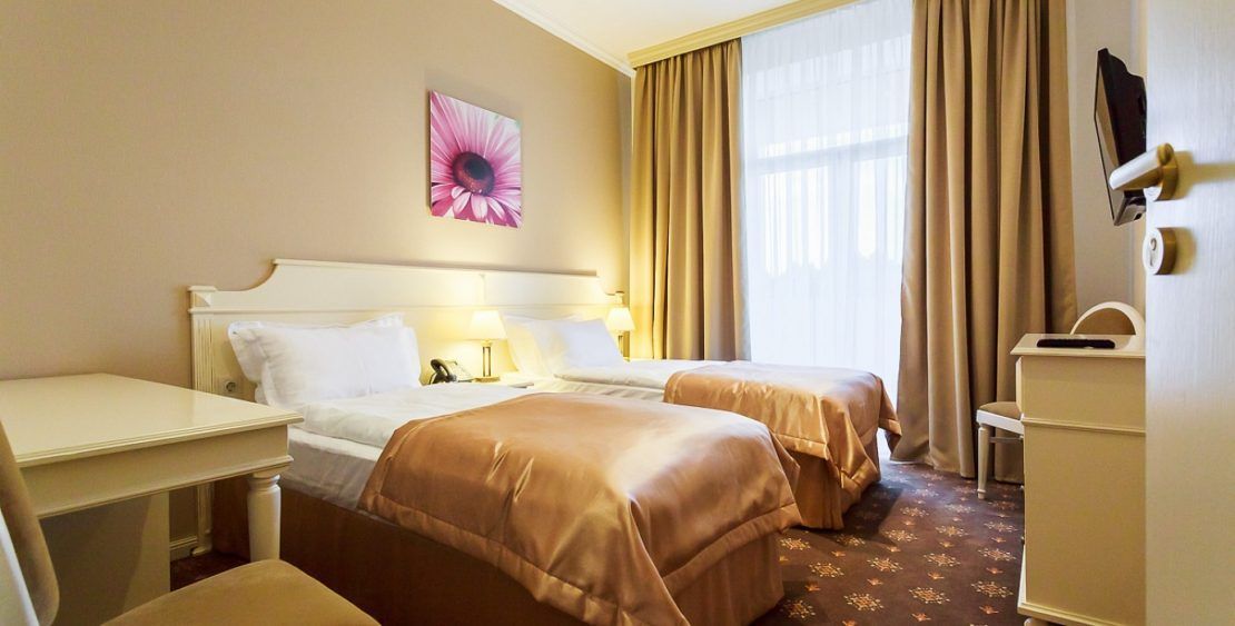 В номере: две односпальные кровати, прикроватные тумбочки, стол, стулья, шкаф, кондиционер, мини-холодильник, сейф, телевизор ЖК, телефон, чайный набор посуды