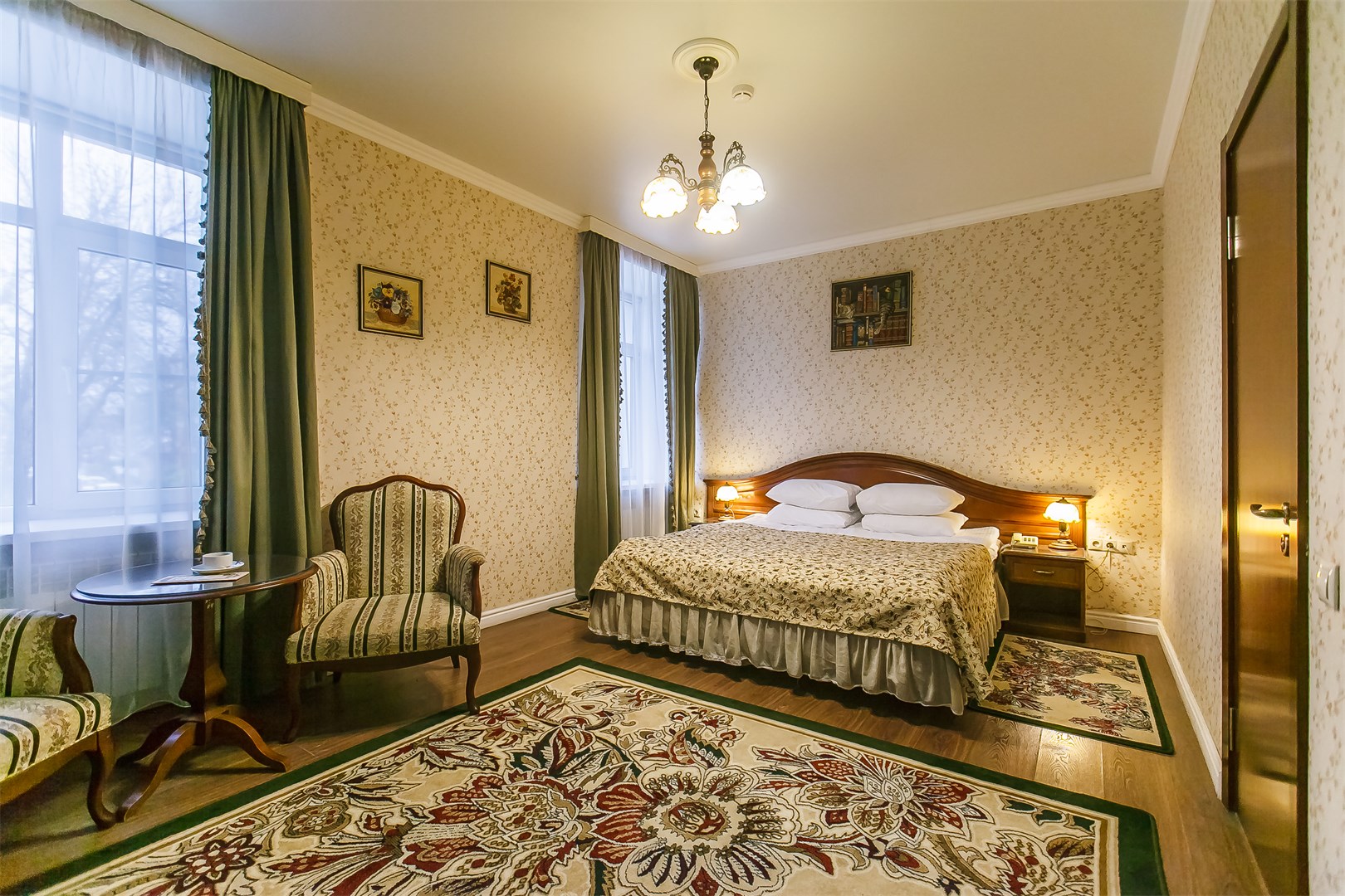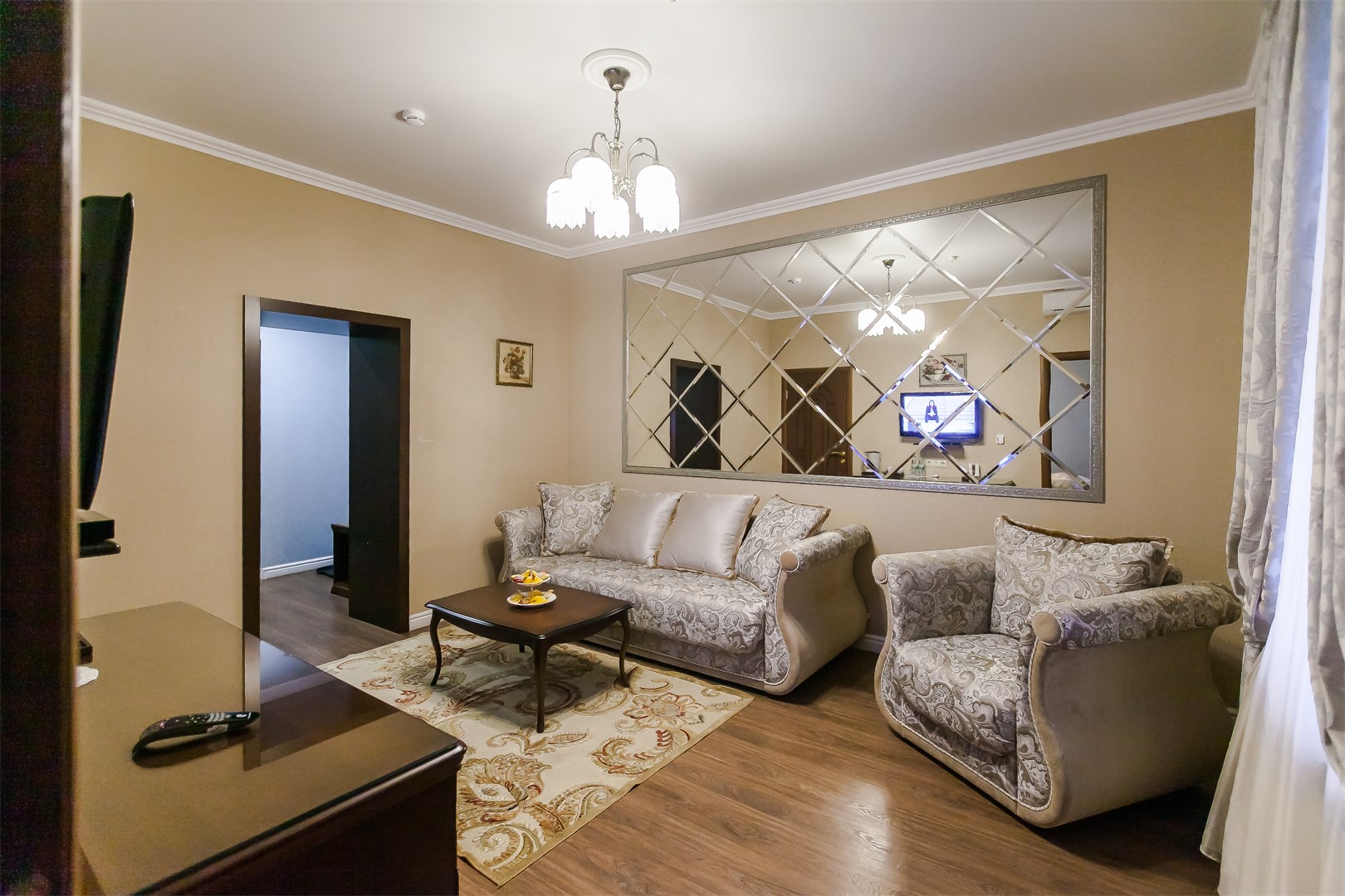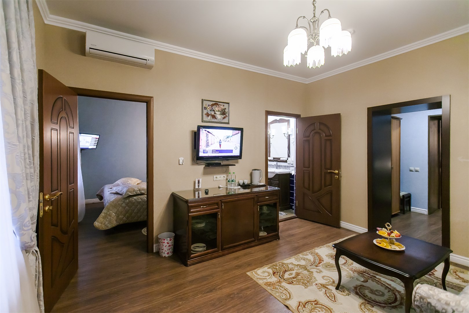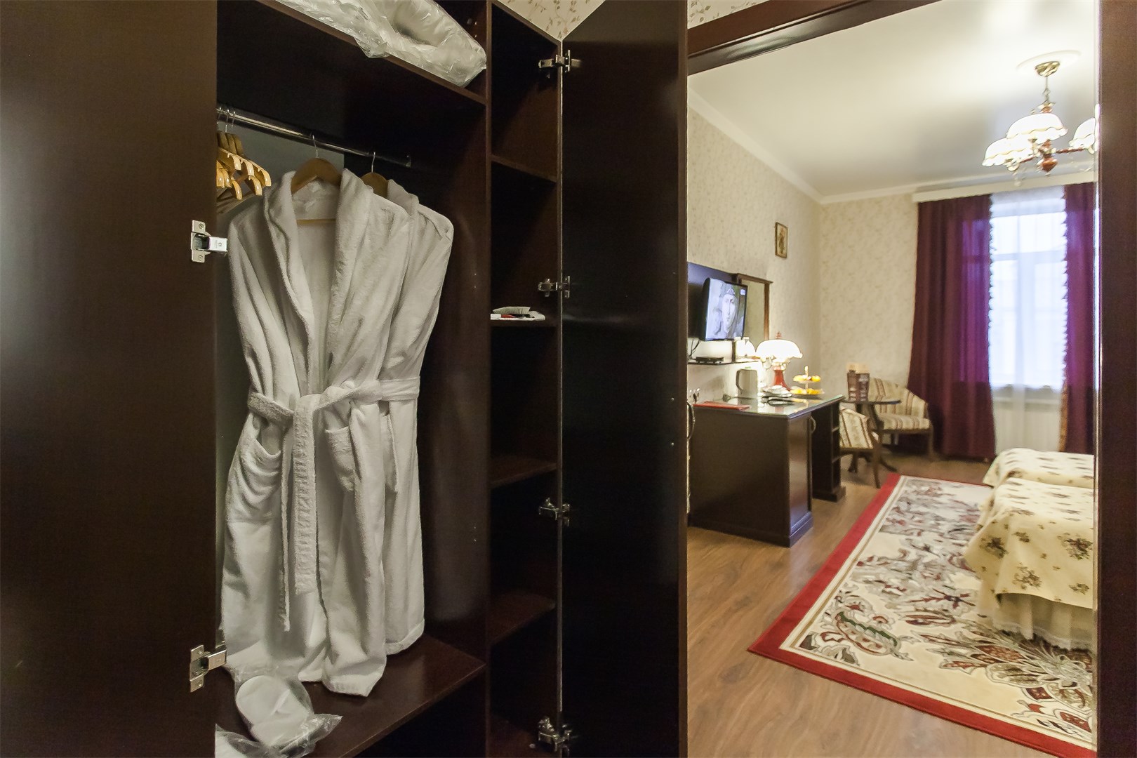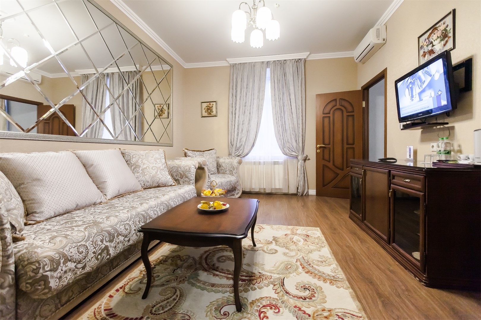 В номере: две односпальные (90*200 см.) кровати – трансформеры, сдвигаются без шва, тв цифровое, телефон, кондиционер, мини-холодильник, письменный стол, стул, зеркало, настольная лампа, бра, туалетный стол, пуф, комод-буфет, диван раскладной, кресло, гардероб с вешалками, вешалка для верхней одежды, багажница, чайник, кофе-машина
