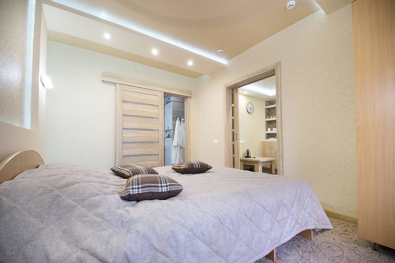 В номере: вешалка, диван раскладной, зеркало, кресло-кровать, кровать двуспальная, прикроватные тумбочки, столик журнальный, шкаф набор посуды, телевизор, холодильник, электрочайник,