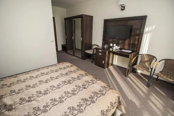 В номере: багажная тумба, зеркало, двуспальная кровать, тумбы, стулья, шкаф-купе, телевизор, светильник, электронные замки, Wi-Fi, телефон