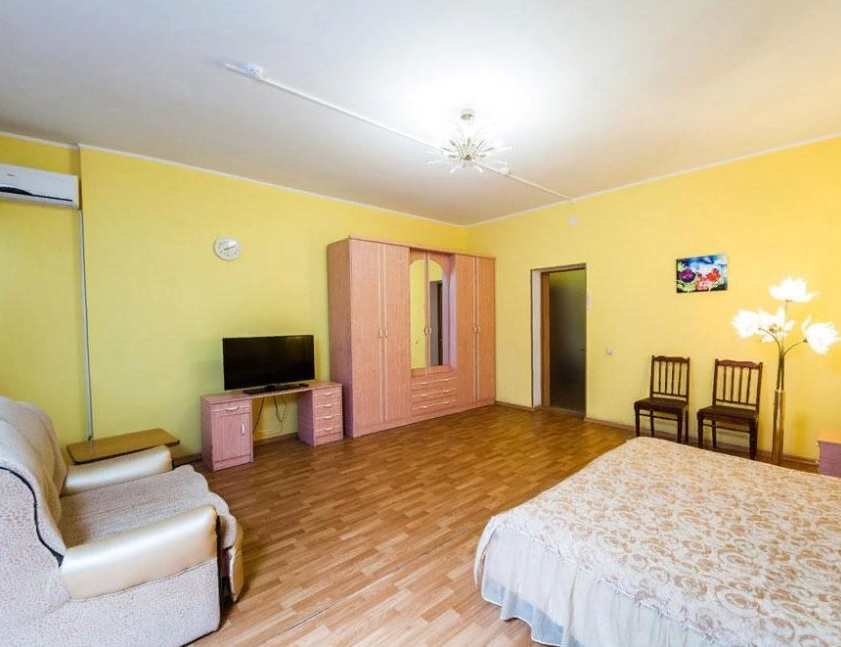 В номере: Двуспальная кровать, кофейный столик, платяной шкаф, телевизор, холодильник, Wi-Fi, фен, белые махровые халат и тапочки.