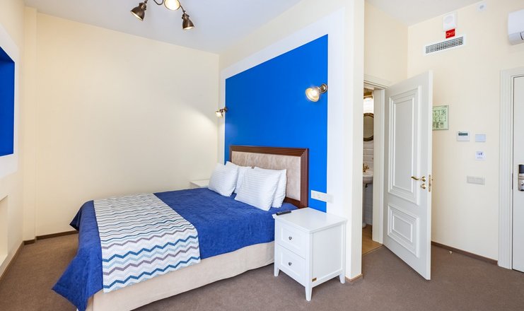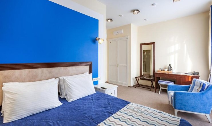 В номере: диван раскладной, зеркало, кресло, кровать двуспальная, прикроватные тумбочки, стол, стулья, тумба багажная, шкаф, кондиционер, мини-холодильник, сейф, телевизор ЖК, телефон, чайный набор посуды, электрочайник